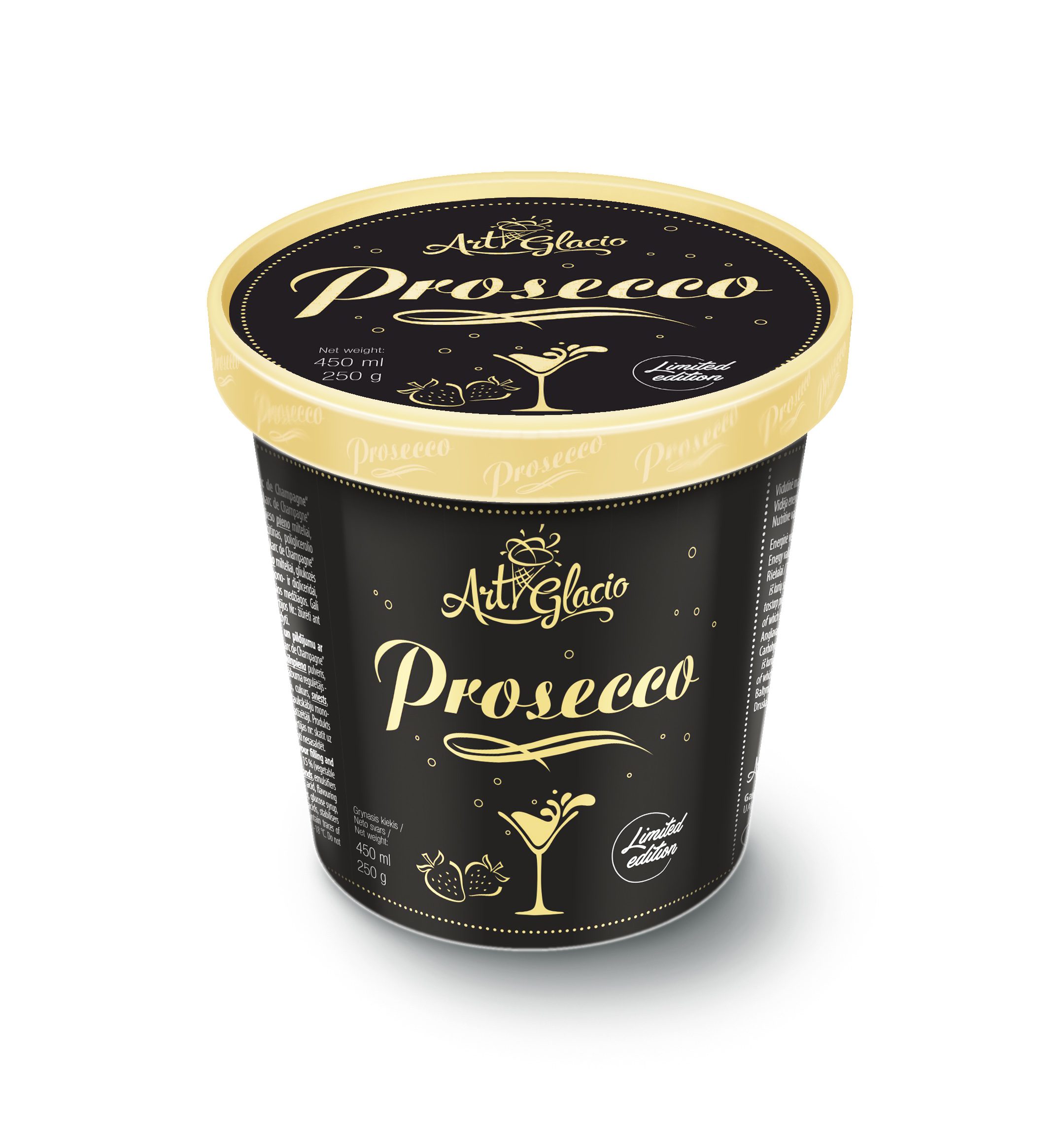 “Prosecco” flavour ice cream with „Marc de Champagne“ flavour filling and strawberries 450 ml / 250 g