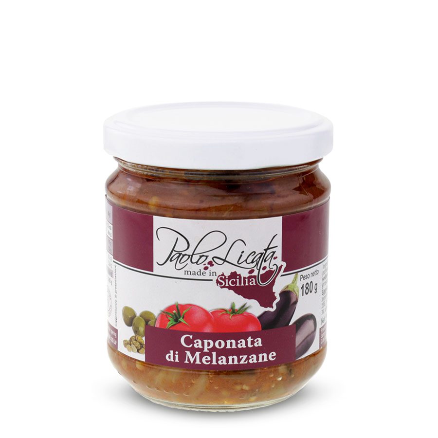 Ingredients: Eggplants 45%, tomato 23%, onion 6%, olives 5%, celery, capers 3%, sunflower oil, wine vinegar, sugar, salt.