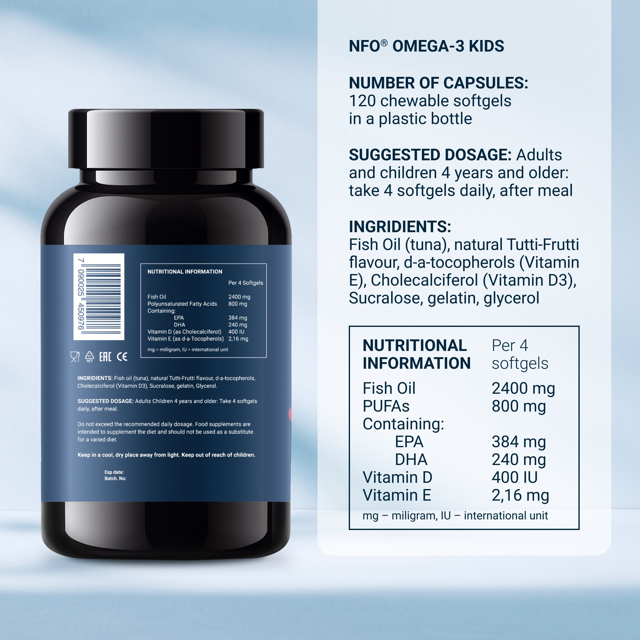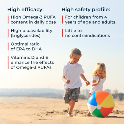 • Additionally contains vitamin E, which enhances the beneficial effects of Omega-3 PUFAs in kids;