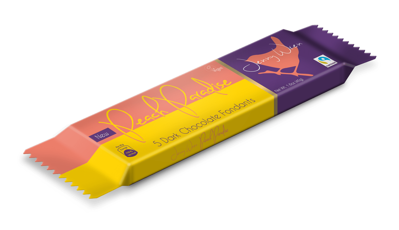 Dark Chocolate with a Peach Fondant centre. The recipe is purely plant based and the wrapper is compostable.