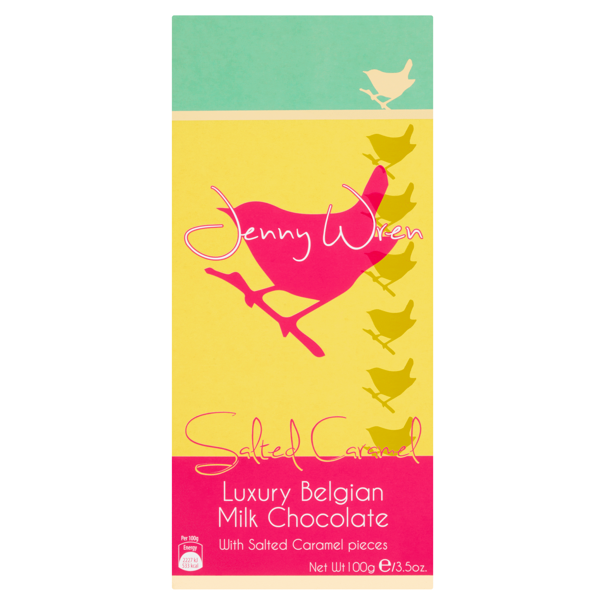 Jenny Salted Caramel Milk chocolate Sharing bar 100g. Delicious Milk Belgian chocolate bars studded with salted caramel pieces, the perfect size for sharing.